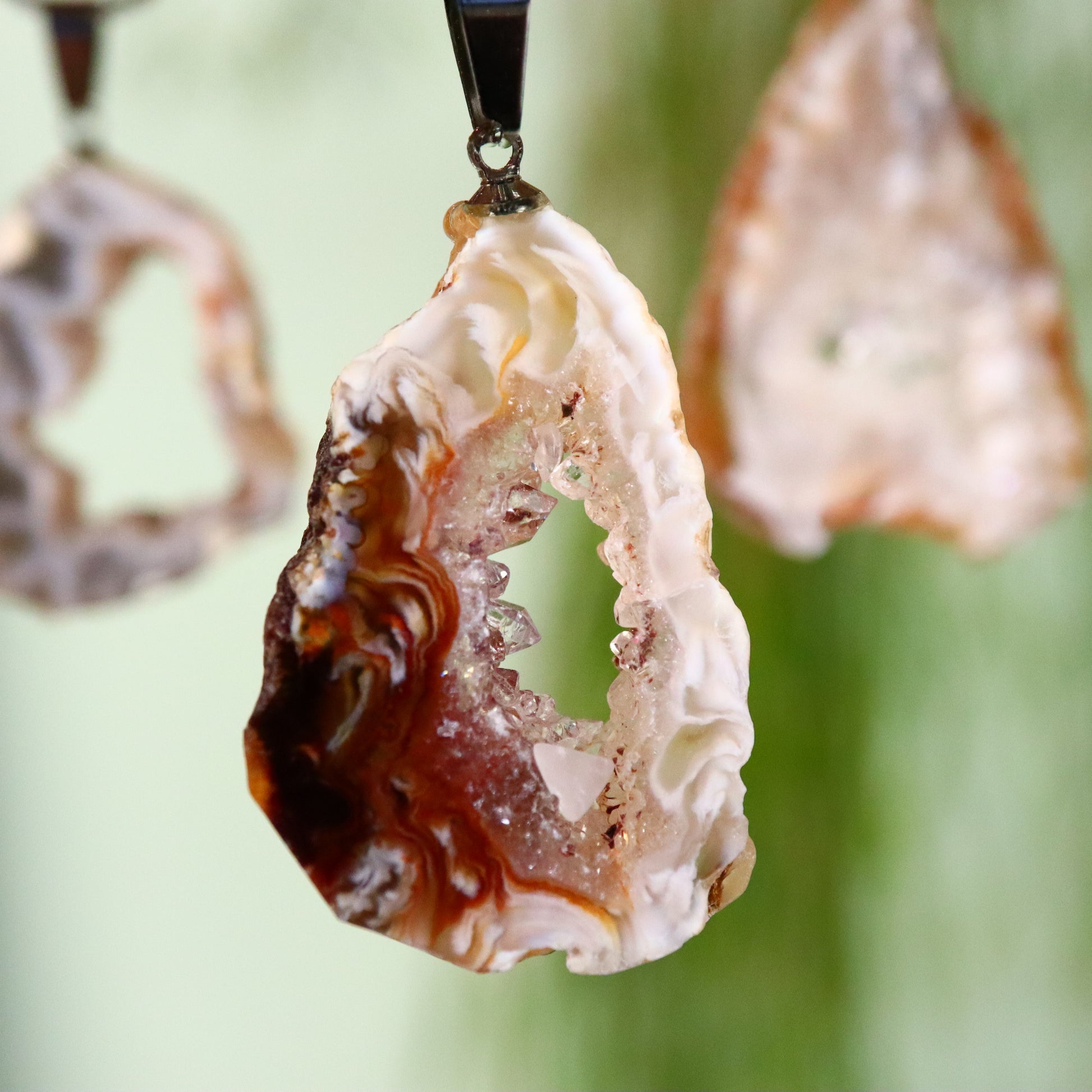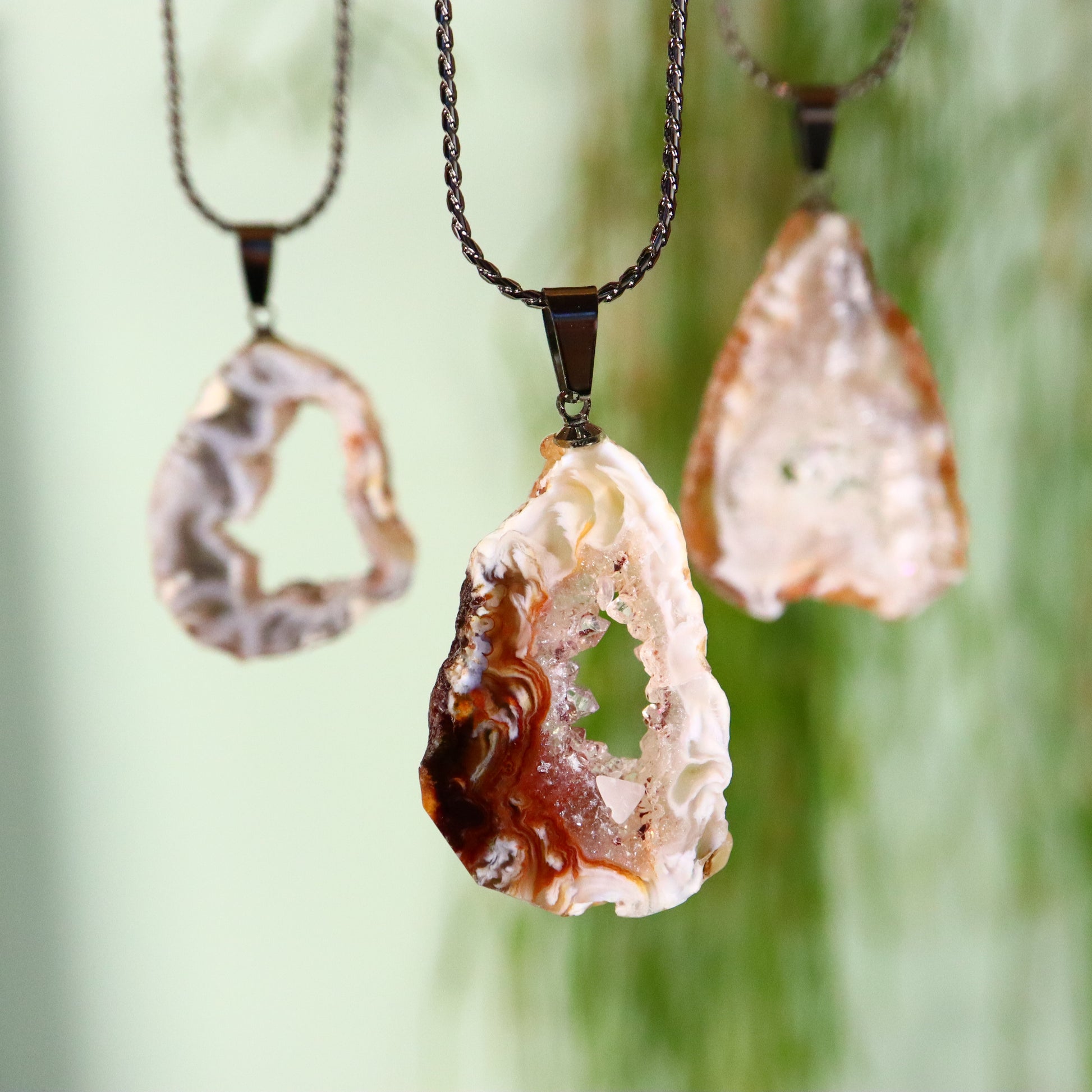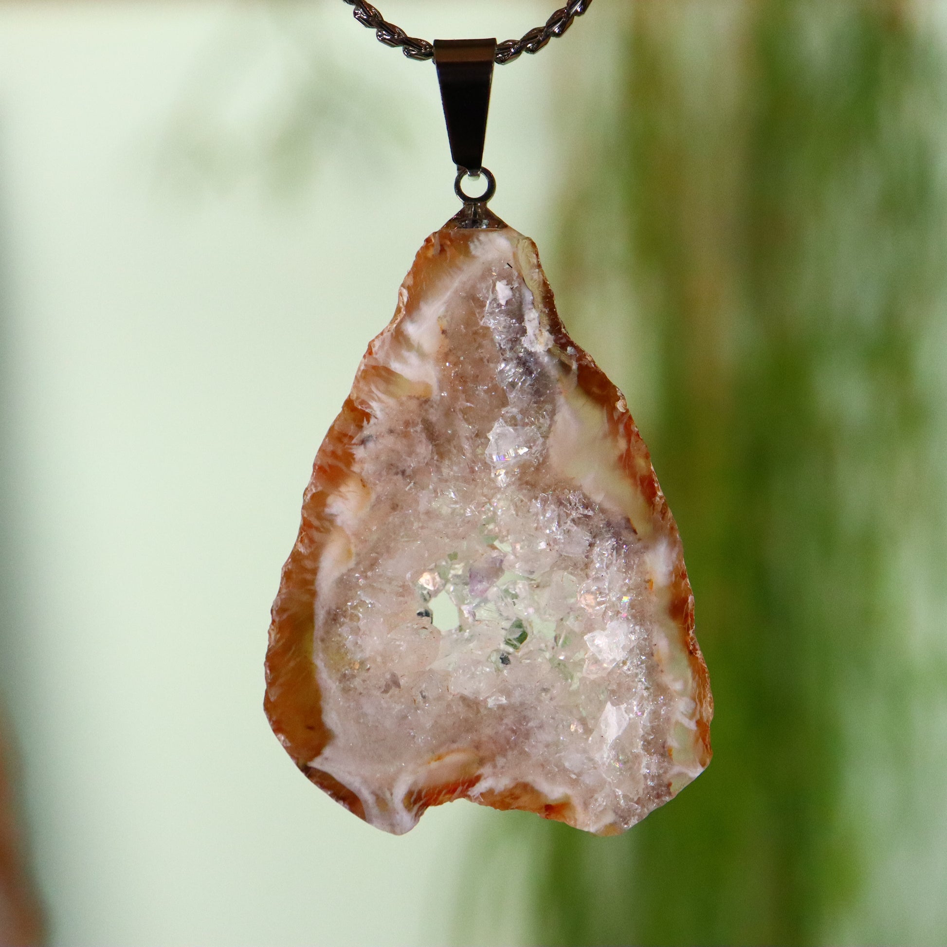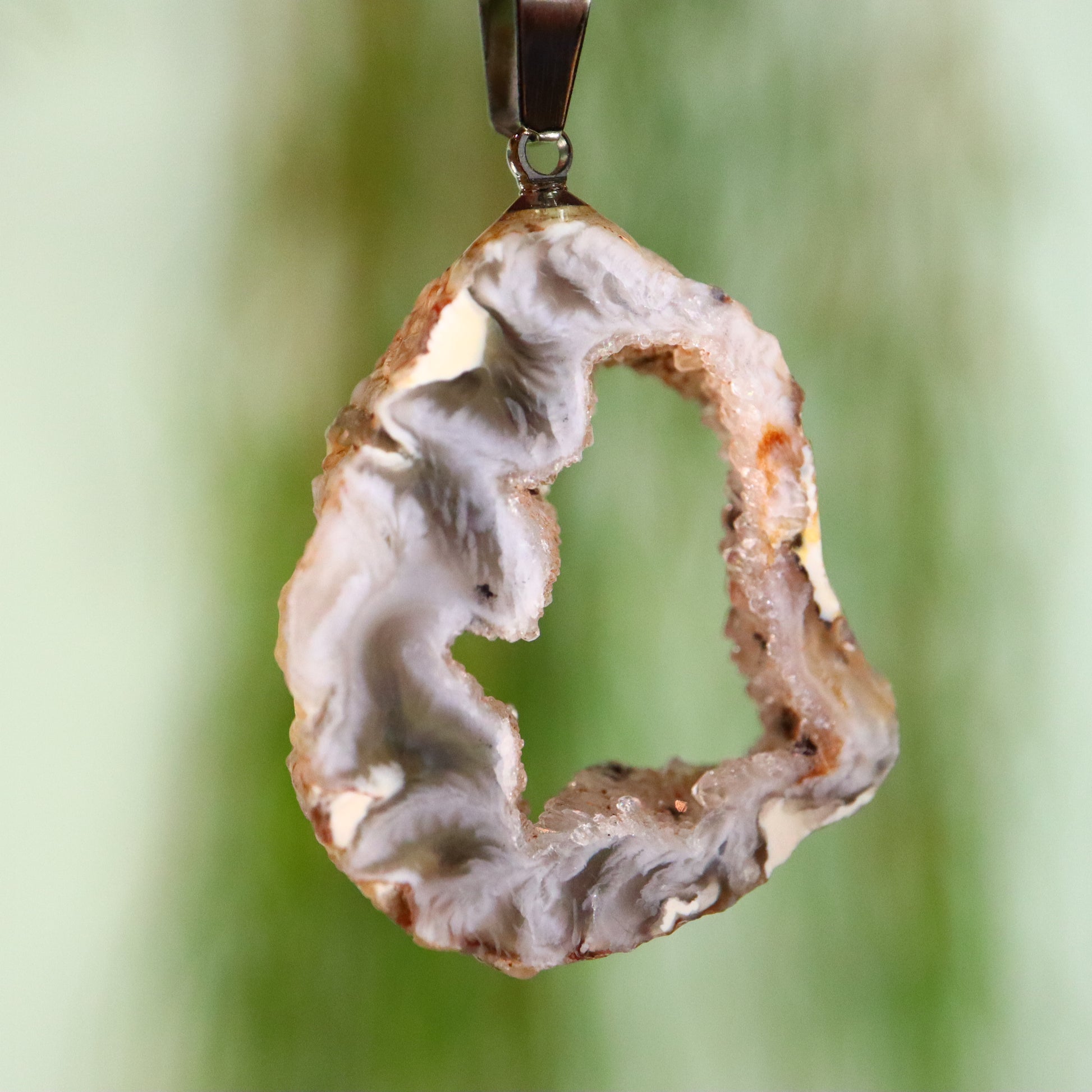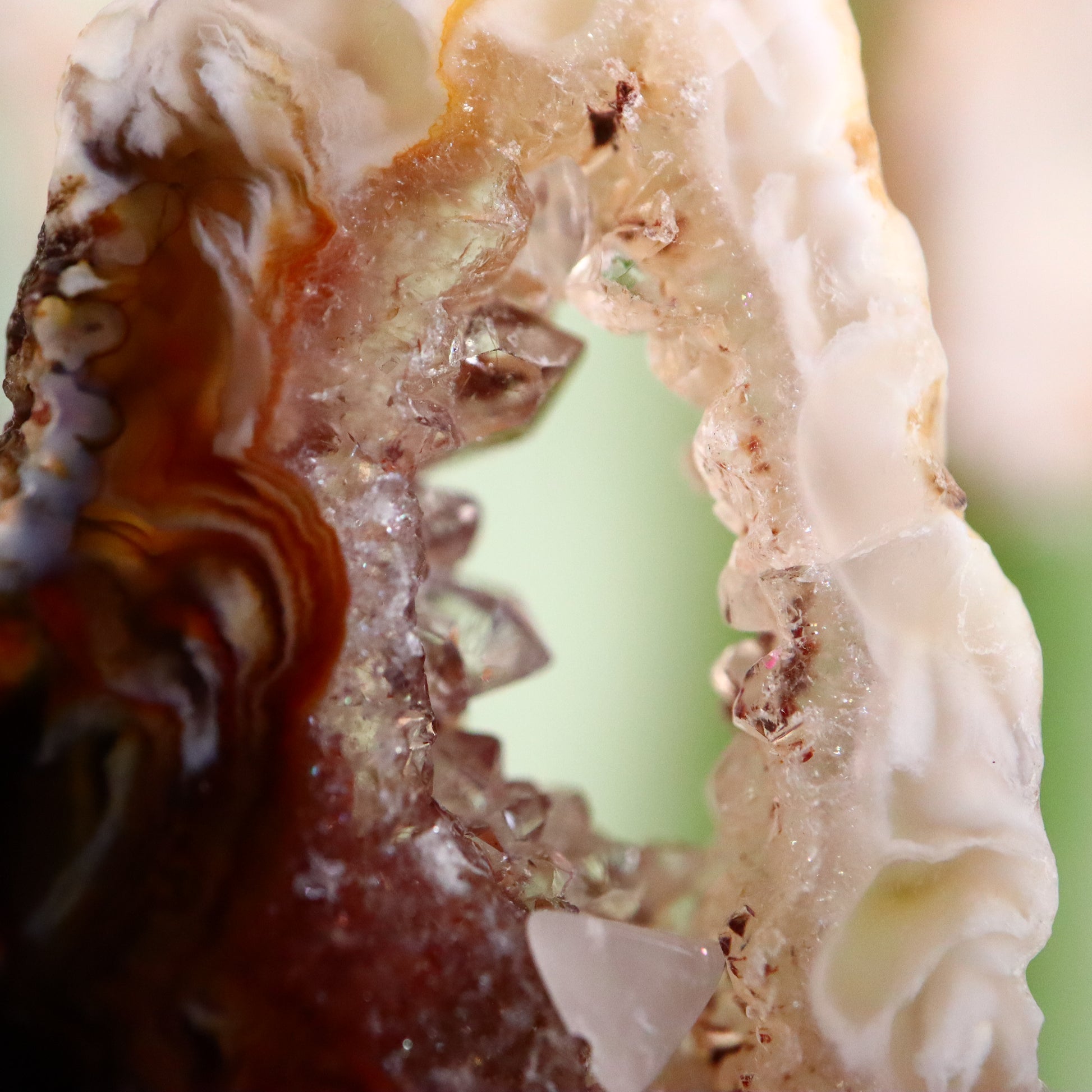 Agaat is een variëteit van chalcedoon, een mineraal dat behoort tot de kwartsfamilie. Het is bekend om zijn fijne korreligheid en veelkleurigheid, vaak met kenmerkende banden of laagjes die het onderscheiden van andere chalcedonen. Agaat heeft een microkristallijne structuur, wat betekent dat de individuele kristallen te klein zijn om met het blote oog te worden waargenomen. Deze fijne korreligheid draagt bij aan zijn gladde oppervlak en polijstbaarheid. Agaat kan in een breed scala aan kleuren voorkomen, waaronder, maar niet beperkt tot, rood, bruin, wit, groen en blauw. De kleuren worden vaak in banden weergegeven, hoewel sommige agaten effen kunnen zijn of complexe patronen kunnen vertonen. Agaat wordt gevormd in holtes van vulkanisch gesteente of in de spleten van sedimentair gesteente, waar silicaat oplossingen indringen en kristalliseren. Het proces kan leiden tot de kenmerkende gelaagdheid.