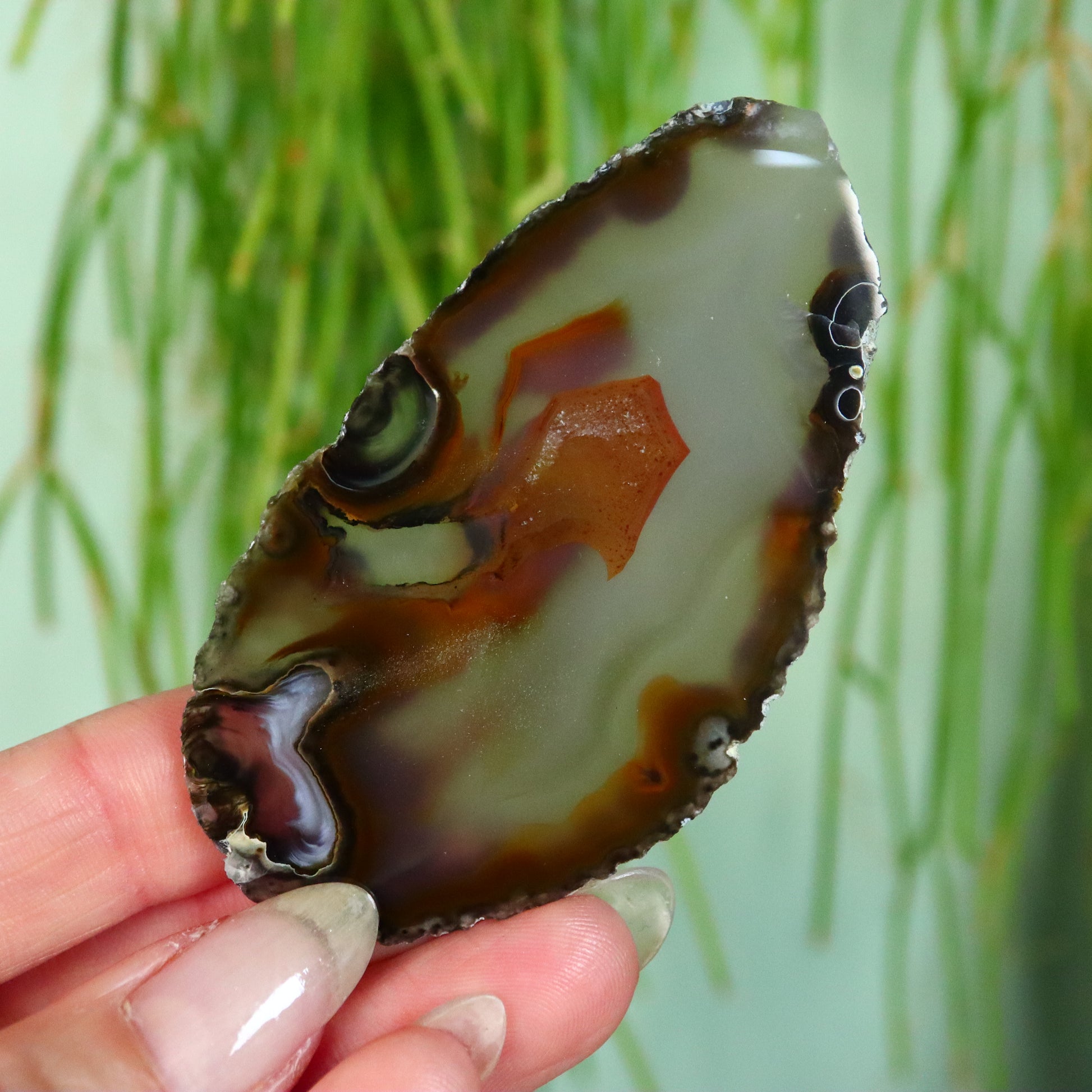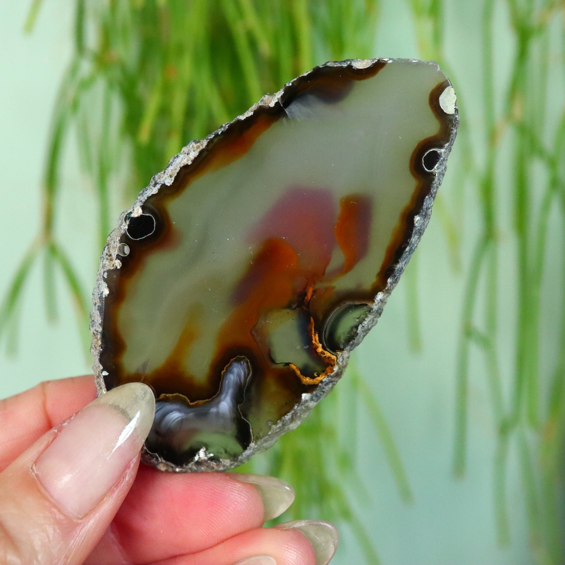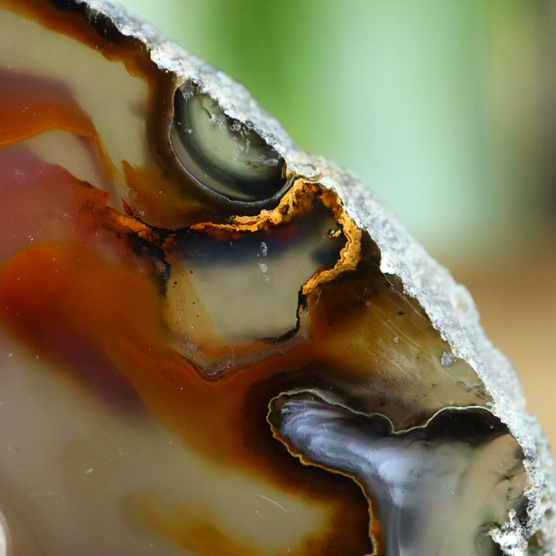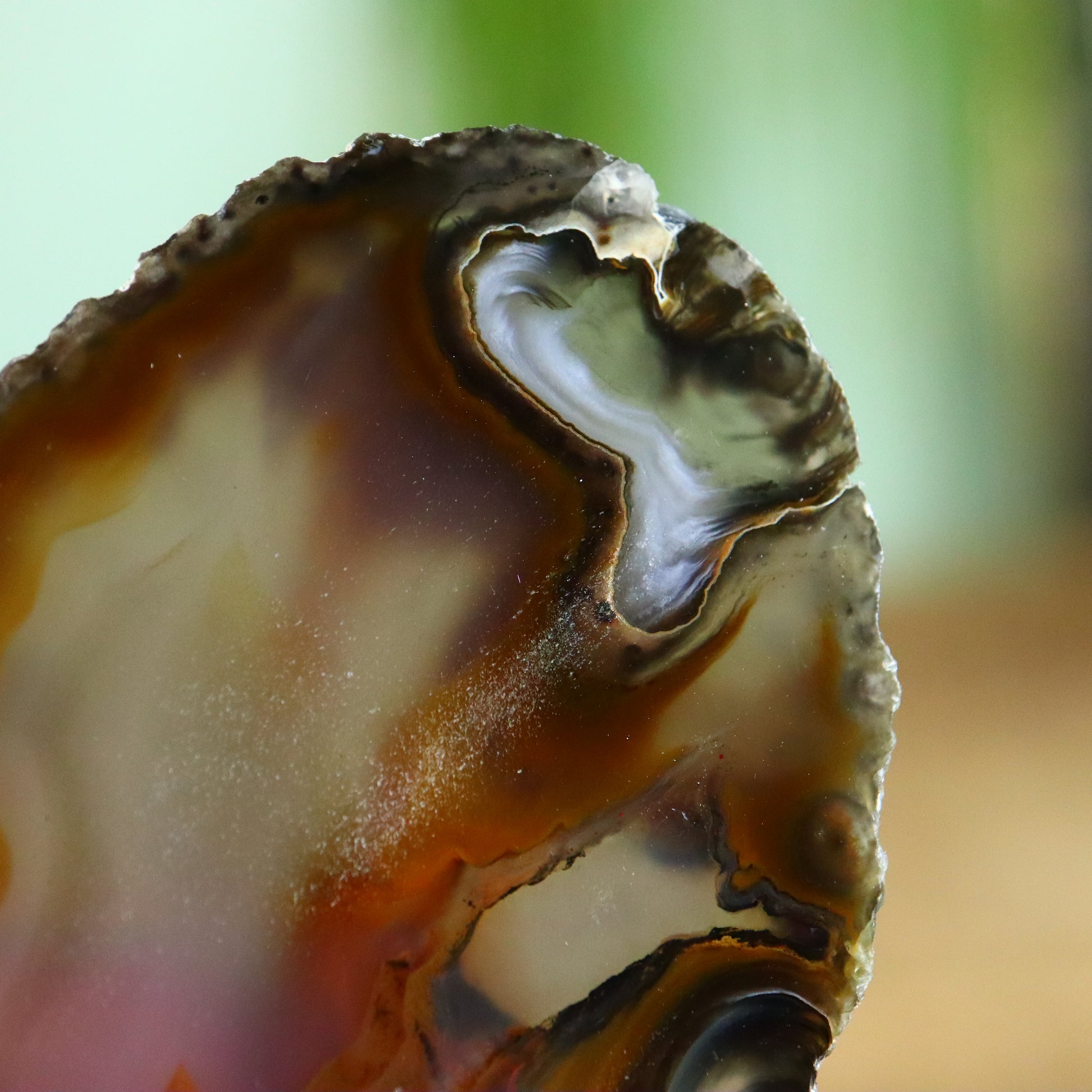 Agaat is een variëteit van chalcedoon, een mineraal dat behoort tot de kwartsfamilie. Het is bekend om zijn fijne korreligheid en veelkleurigheid, vaak met kenmerkende banden of laagjes die het onderscheiden van andere chalcedonen. Agaat heeft een microkristallijne structuur, wat betekent dat de individuele kristallen te klein zijn om met het blote oog te worden waargenomen. Deze fijne korreligheid draagt bij aan zijn gladde oppervlak en polijstbaarheid. Agaat kan in een breed scala aan kleuren voorkomen, waaronder, maar niet beperkt tot, rood, bruin, wit, groen en blauw. De kleuren worden vaak in banden weergegeven, hoewel sommige agaten effen kunnen zijn of complexe patronen kunnen vertonen Agaat wordt gevormd in holtes van vulkanisch gesteente of in de spleten van sedimentair gesteente, waar silicaat oplossingen indringen en kristalliseren. Het proces kan leiden tot de kenmerkende gelaagdheid.
