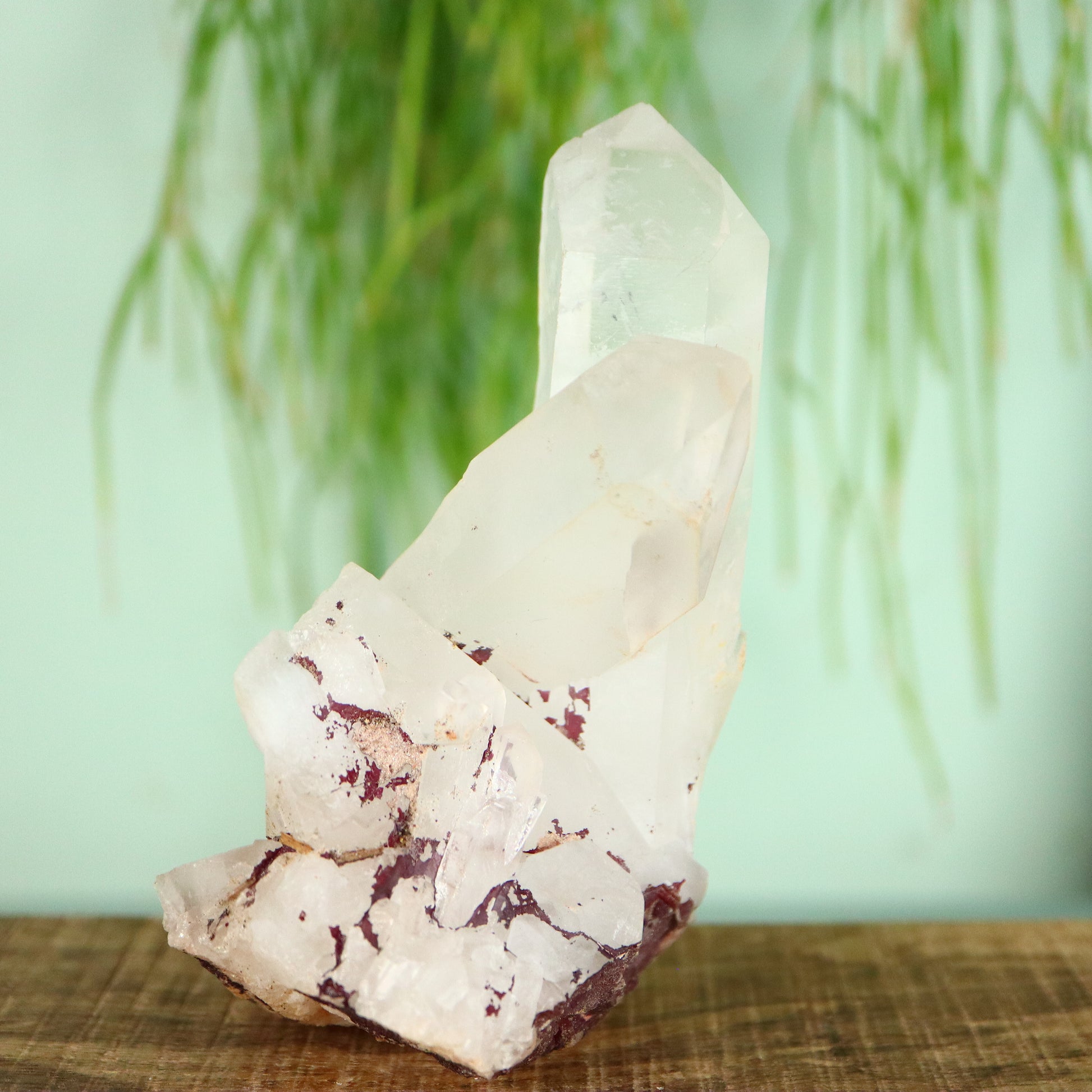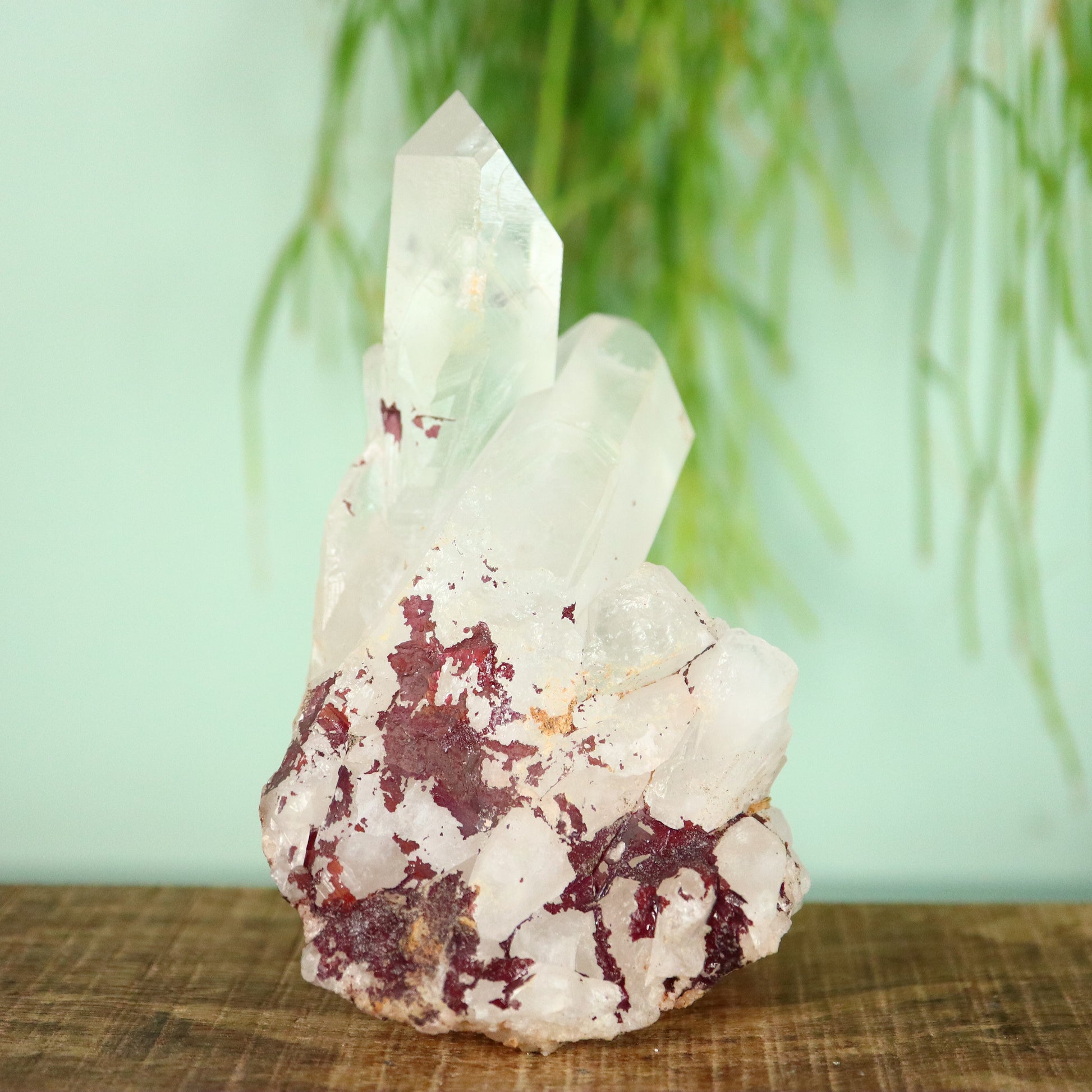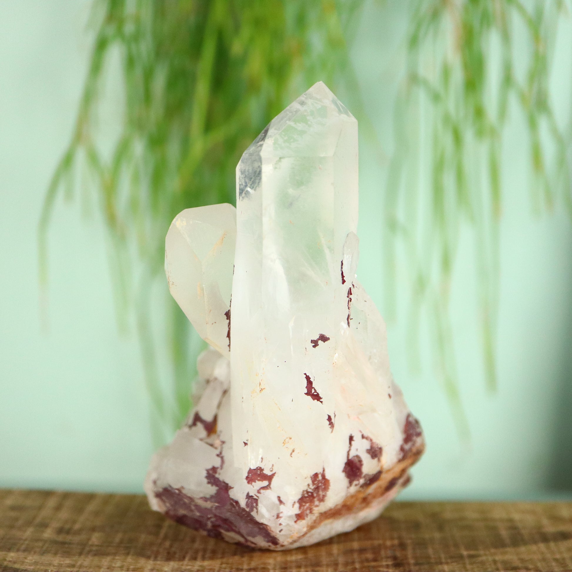 Het rode op het kristal is hematiet, en is gemakkelijk te verwijderen mocht je dat graag willen.