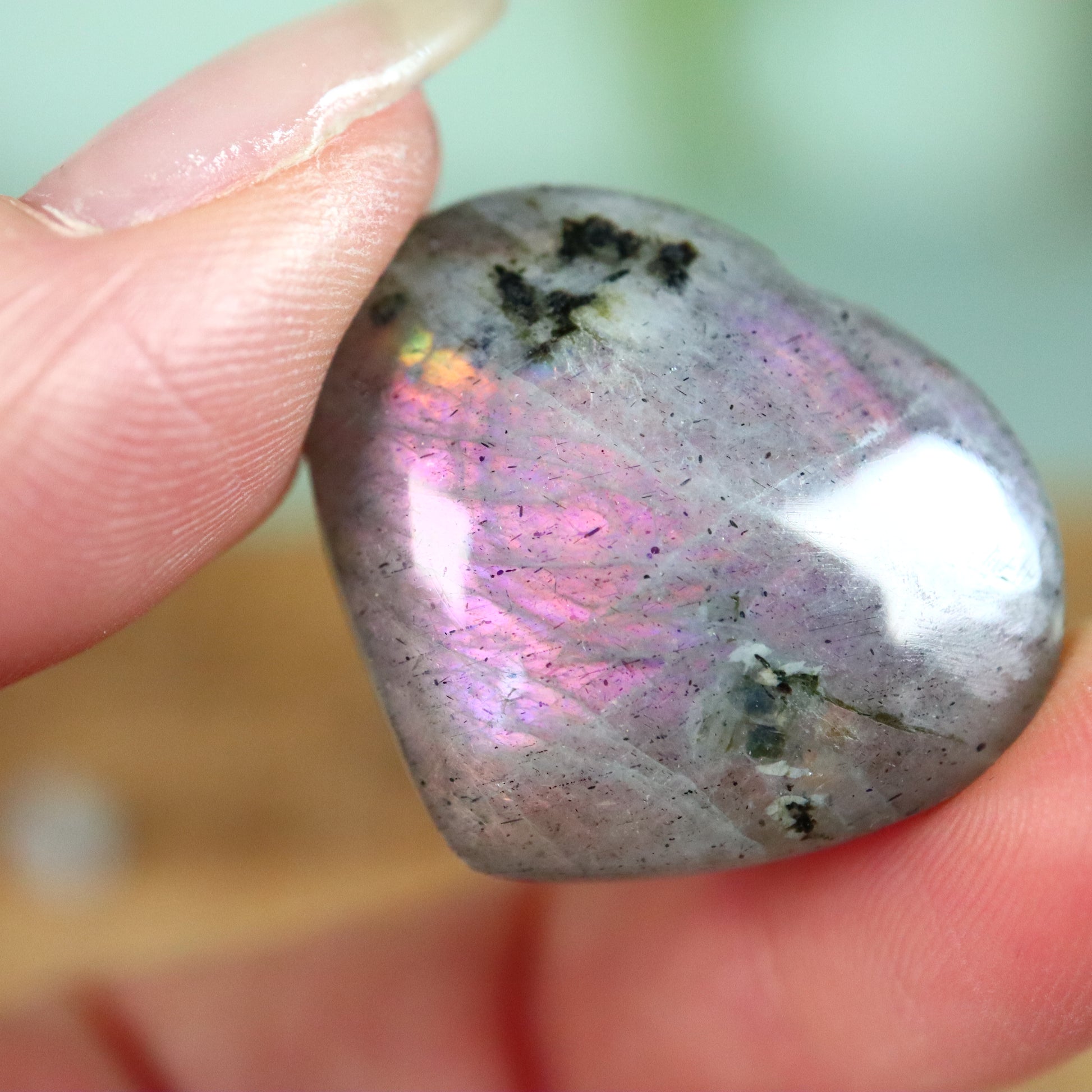 Groen: Groen licht heeft golflengtes die langer zijn dan blauw en paars maar korter dan geel. Het verschijnen van groen in labradoriet kan worden veroorzaakt door een overgang in de reflectie van kortere naar langere golflengtes, wat zorgt voor een rijk palet aan groene tinten.