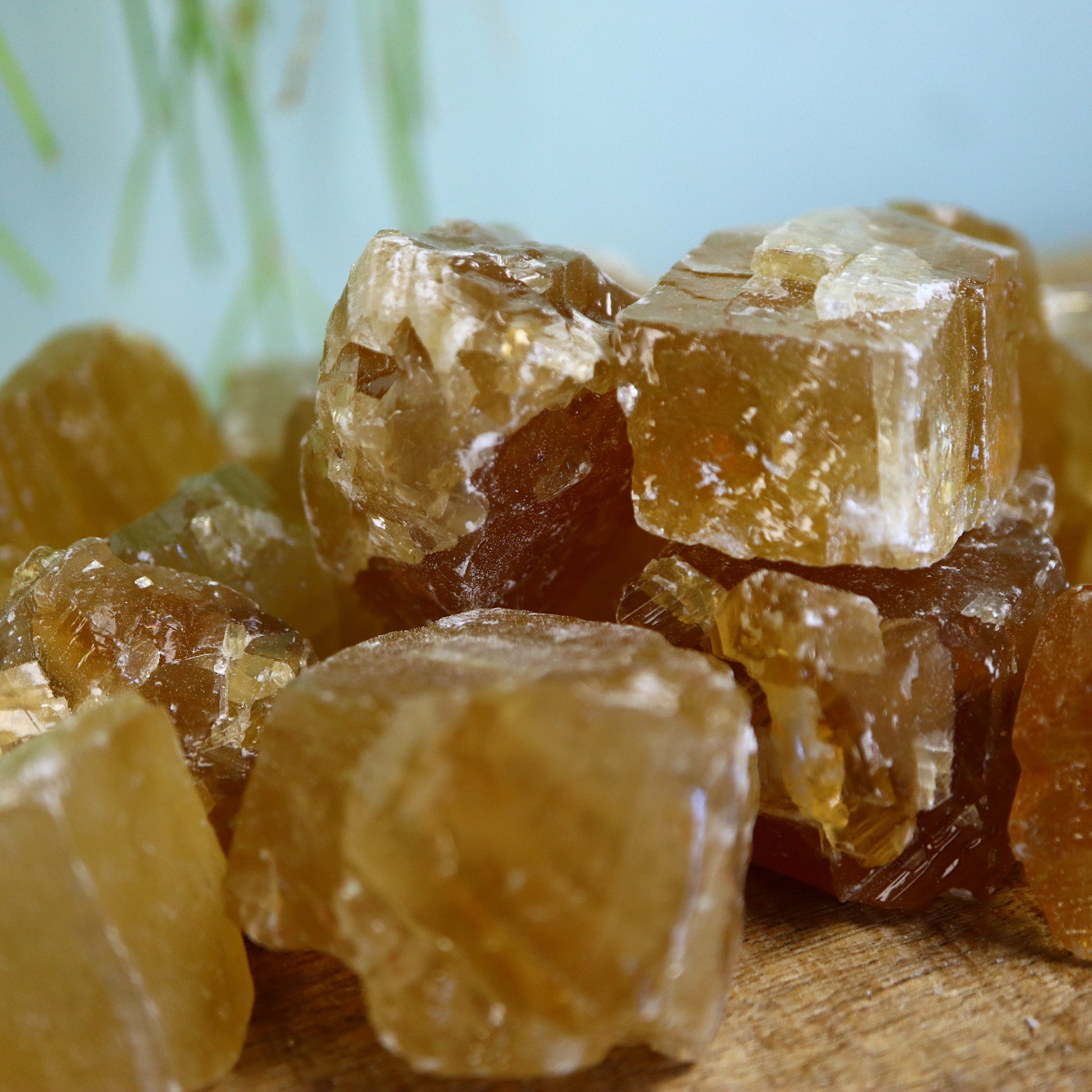 Honey en Gele Calciet: Net als honey calciet, wordt de gele kleur vaak veroorzaakt door sporen van ijzer of mangaan. De Honey calciet reageert op uv, en veranderd hieronder van kleur