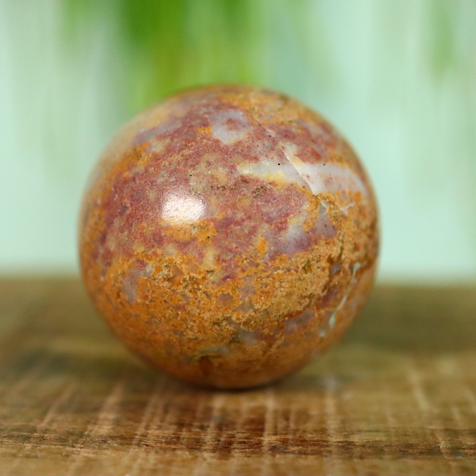 Oranje/Roze: Deze kleuren kunnen ontstaan door een mix van ijzeroxiden of door fijne insluitsels van ijzerrijke mineralen in lagere concentraties dan in rode jaspis.