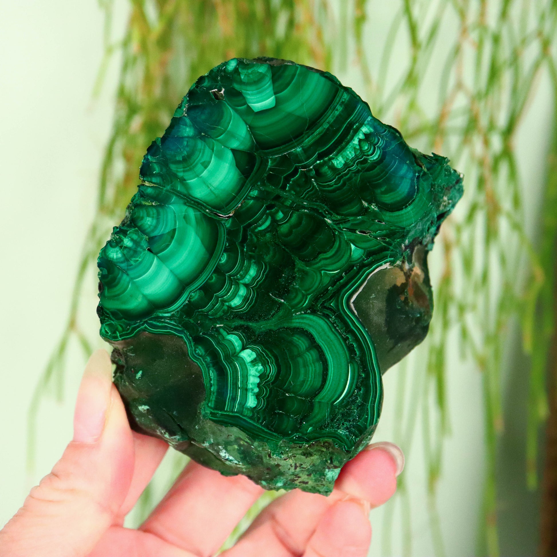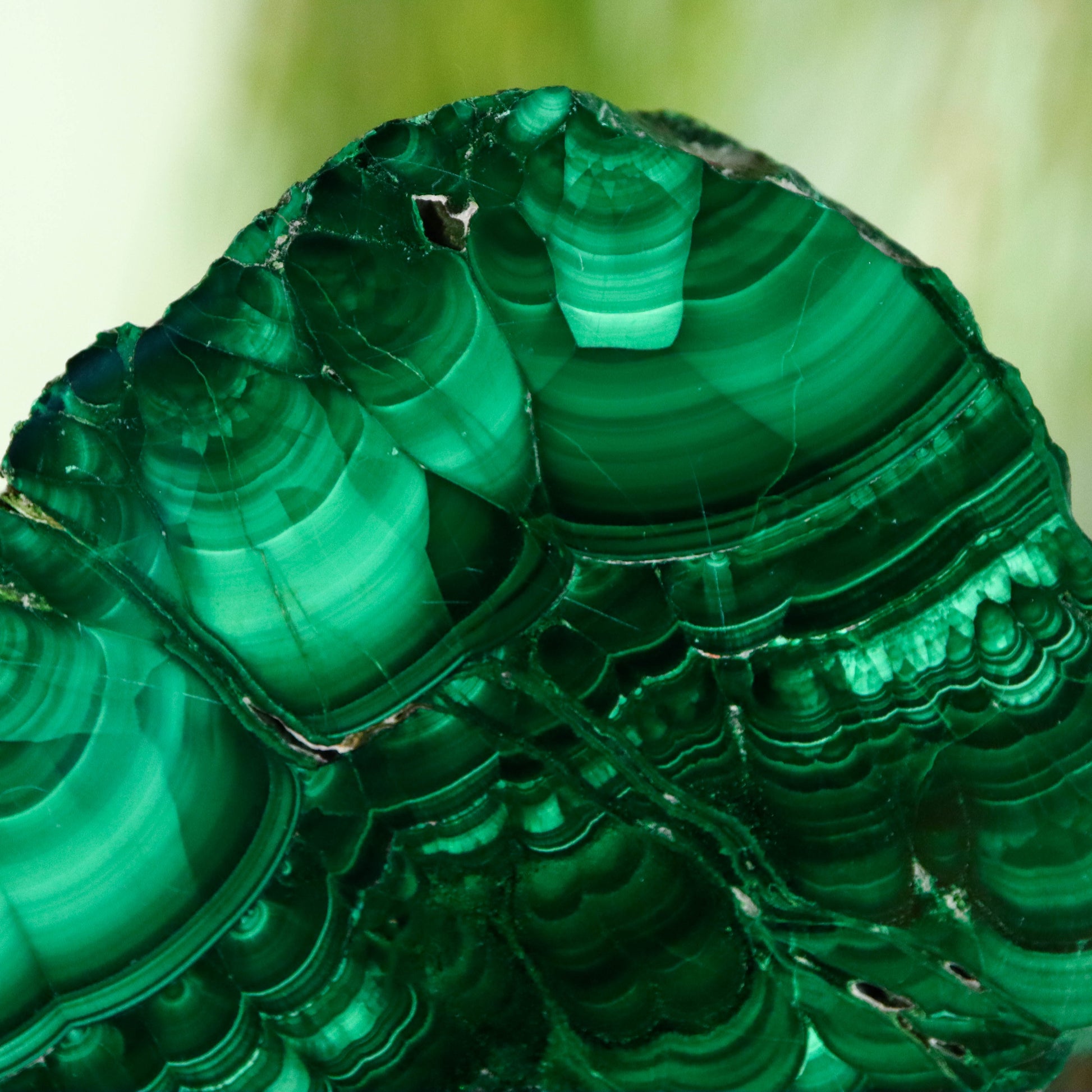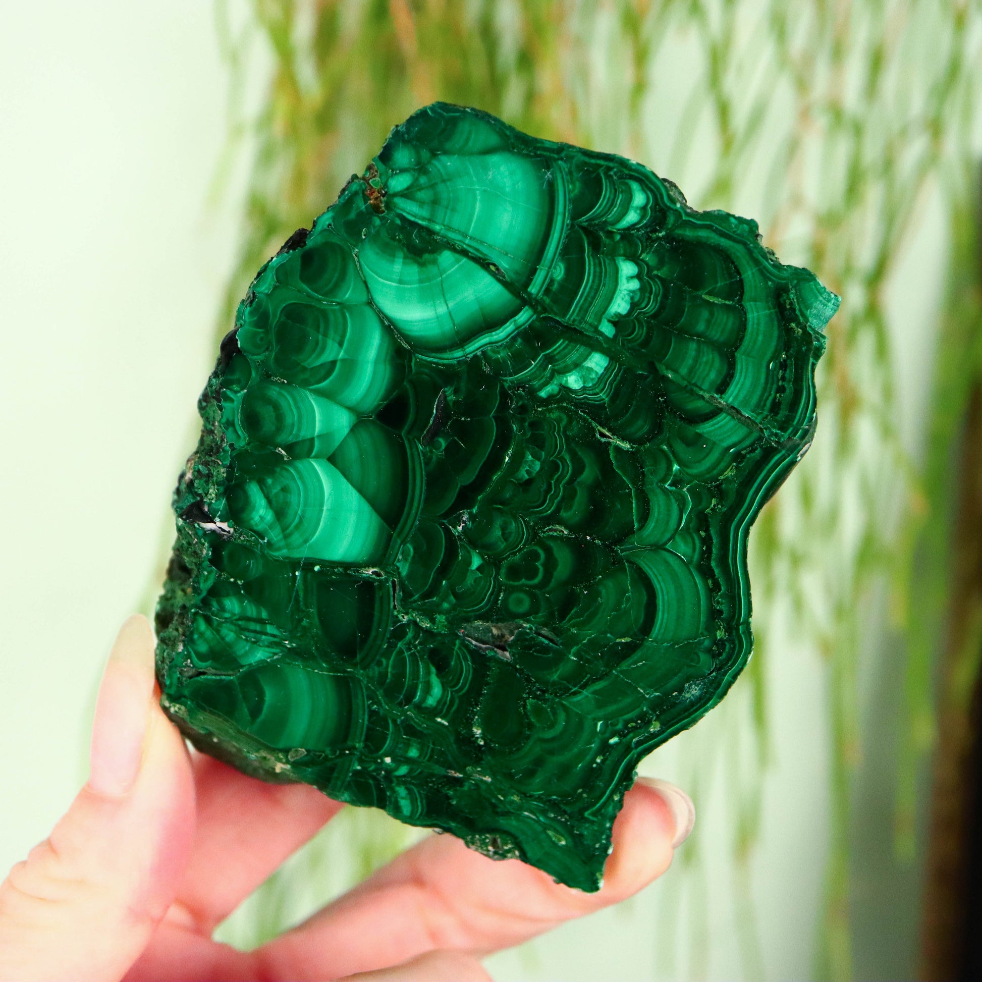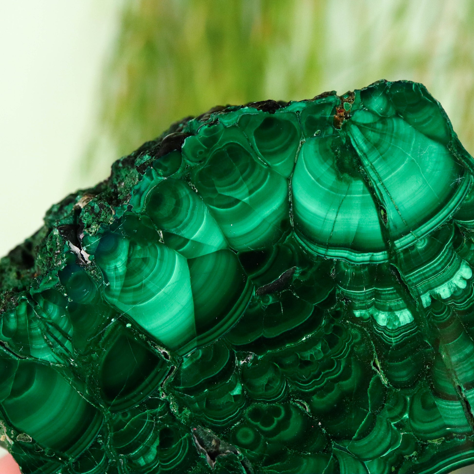 Malachiet is een koper-carbonaat mineraal dat bekend staat om zijn opvallende groene kleuren en golvende bandpatronen. Het is niet alleen een populair siersteen maar ook een belangrijk erts voor de winning van koper. De levendige kleuring en unieke structuren maken het een favoriet onder verzamelaars en liefhebbers van edelstenen. Malachiet bestaat uit koper, koolstof, en hydroxidegroepen. De rijke groene kleur is te danken aan het kopergehalte in de chemische structuur. Malachiet kristalliseert in het monokliene kristalstelsel. Het wordt vaak gevonden in de vorm van naaldvormige kristallen of als radiaal gegroepeerde naalden die samen massieve of botryoïdale (druiventros-achtige) formaties vormen. Botryoïdale Malachiet: Deze vorm kenmerkt zich door bolvormige aggregaten die lijken op een tros druiven. Dit is een veelvoorkomende morfologie voor malachiet, waarbij de rondachtige vormen een glanzend en glad oppervlak hebben. Fluweel Malachiet: Een minder gebruikelijke vorm van malachiet, fluweel malachiet, heeft een zachte, fluweelachtige textuur van fijne kristallen die meer delicate en vezelige patronen vertonen dan de meer gebruikelijke botryoïdale vorm. De kleur van malachiet varieert van lichtgroen tot donkergroen, en het mineraal is bijna altijd bandvormig met alternerende lichte en donkere groene lagen. Deze banden kunnen golven, cirkels of spiralen vormen, wat het een zeer decoratief uiterlijk geeft. Malachiet wordt meestal gevormd in de oxidatiezones van koperertsen door de chemische reactie van koolstofdioxide en water met koperhoudende mineralen. Het wordt vaak geassocieerd met andere kopermineralen zoals azuriet, cupriet en chalcopyriet.